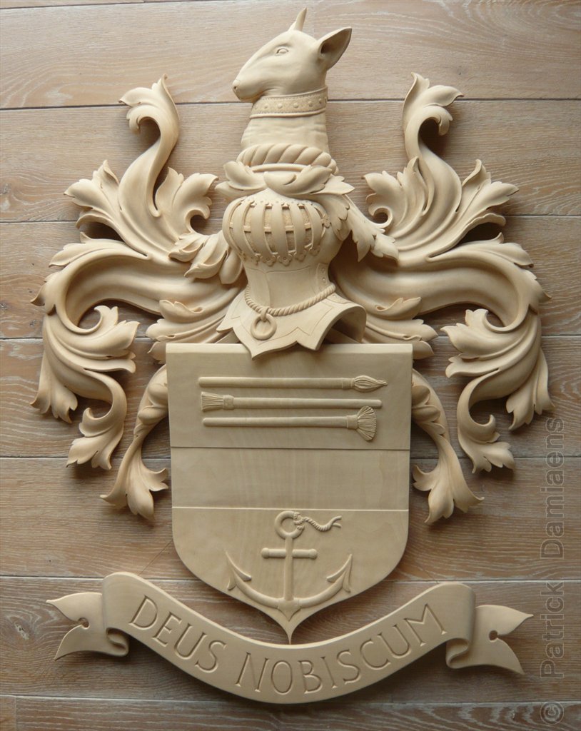 stadia van bewerkingen bij het snijden van een heraldisch familiewapen in